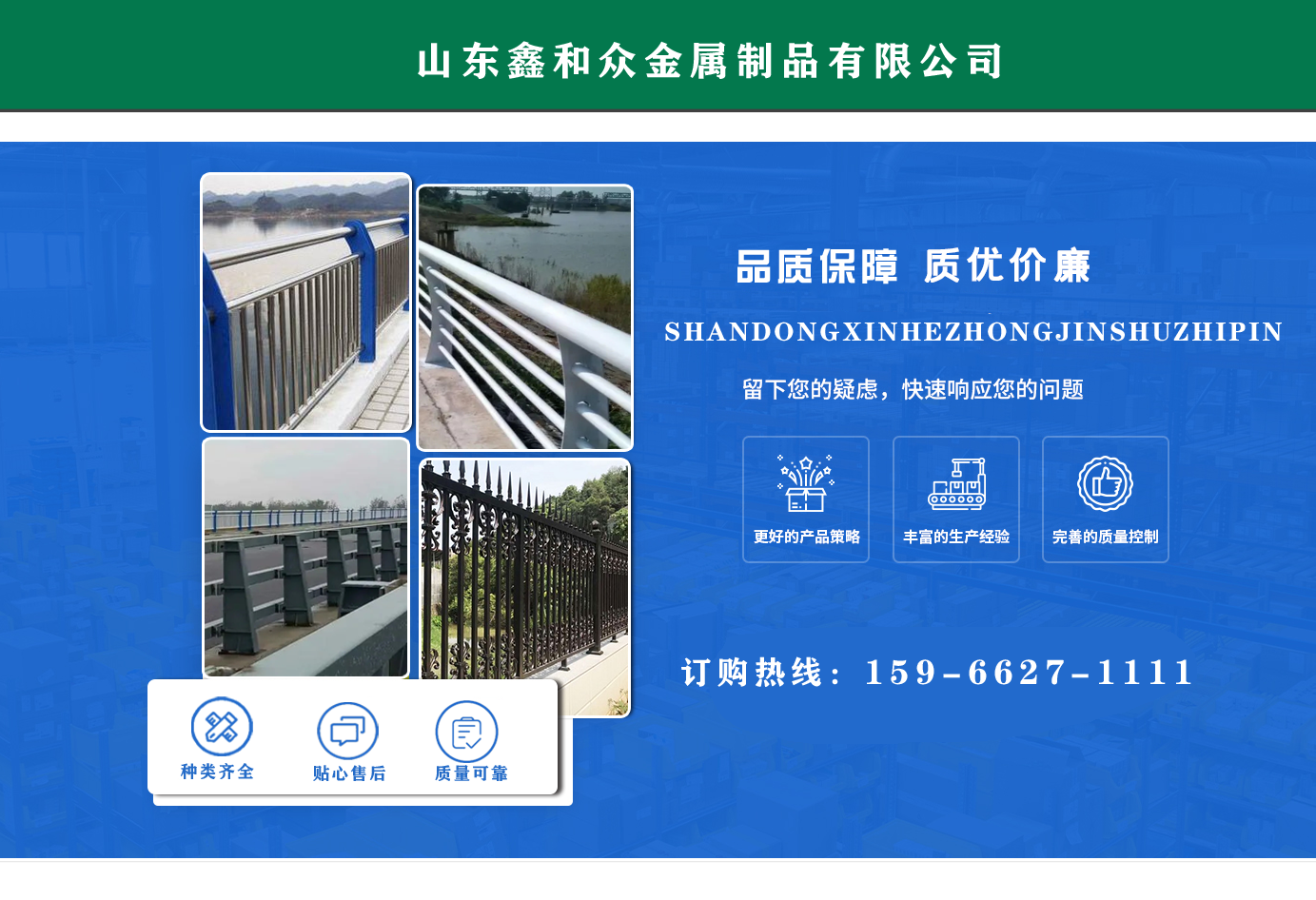 山東鑫和眾金屬制品有限公司主要產(chǎn)品有防撞護(hù)欄,橋梁護(hù)欄,道路護(hù)欄,河道護(hù)欄,不銹鋼護(hù)欄等護(hù)欄。提供設(shè)計(jì)方案,一站式定制,包您滿(mǎn)意價(jià)格優(yōu)惠,歡迎來(lái)電咨詢(xún)! 公司常年從事銷(xiāo)售護(hù)欄防撞護(hù)欄,橋梁護(hù)欄,道路護(hù)欄,河道護(hù)欄,不銹鋼護(hù)欄,橋梁鋼護(hù)欄,河道燈光護(hù)欄等。產(chǎn)品廣泛應(yīng)用于橋梁、河道、旅游景區(qū)、道路、公路、公園、小區(qū)、景觀(guān)、道路防撞等領(lǐng)域。 公司產(chǎn)品均采用優(yōu)質(zhì)不銹鋼材料,符合相關(guān)標(biāo)準(zhǔn)。各種型號(hào)不銹鋼復(fù)合管及護(hù)欄,質(zhì)量嚴(yán)格把控。產(chǎn)品強(qiáng)度高、耐腐蝕、焊接牢固、抗沖擊、性能好,防撞護(hù)欄結(jié)構(gòu)簡(jiǎn)單、美觀(guān)實(shí)用大方?! g迎前來(lái)訂購(gòu)!...